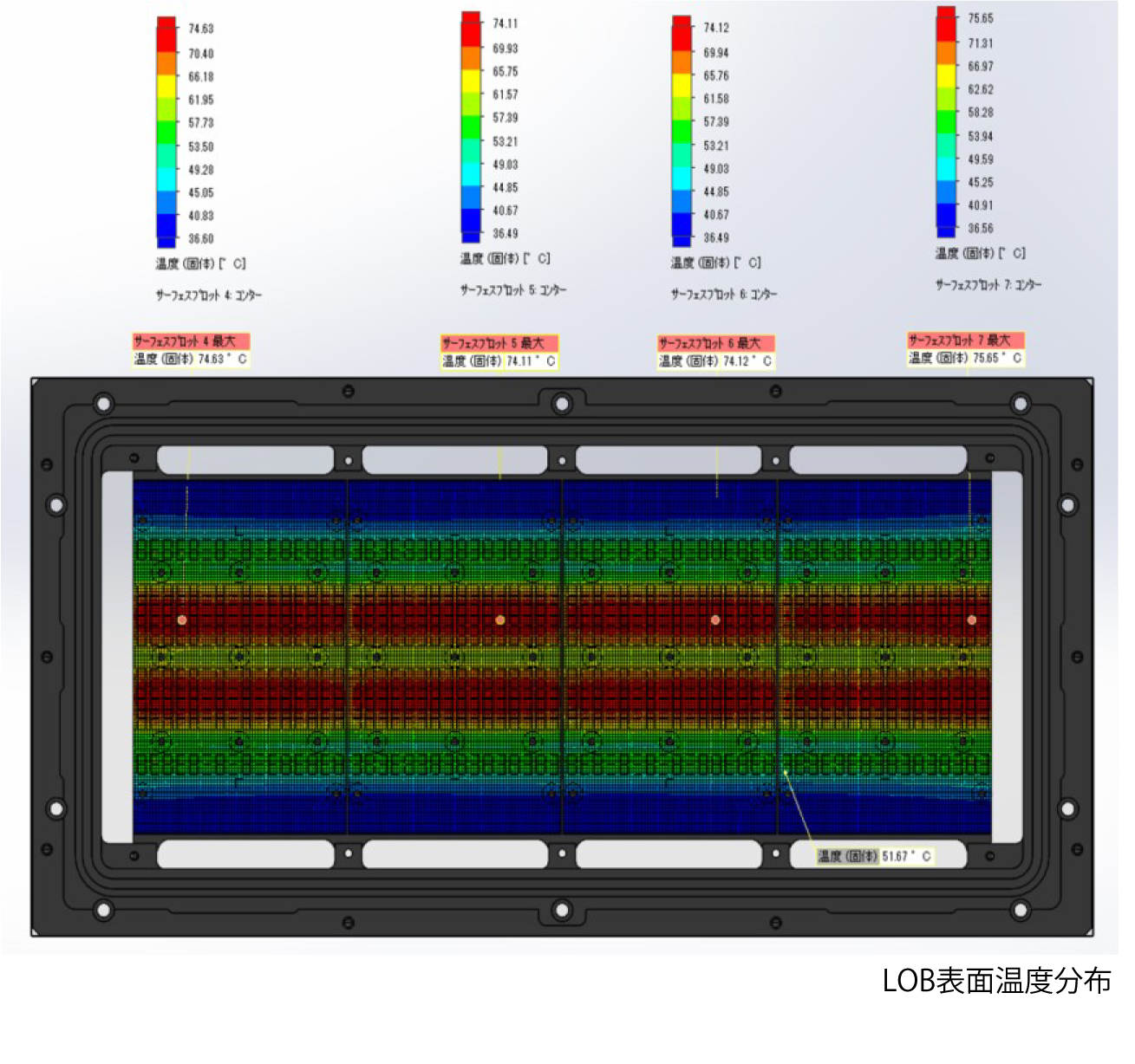 当社では熱流体解析ソフトを導入し、設計段階でのシミュレーションから完成後の熱分布測定までを詳細に実施。さらに、冷却水温や流量変動に対する照度影響も評価し、安定した品質を保証します。