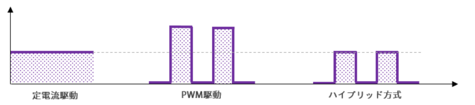 ・ 定電流駆動/PWM駆動をそれぞれ選択可能。ハイブリッド方式として定電流でピーク照度を抑えたPWM駆動方式も可能です。